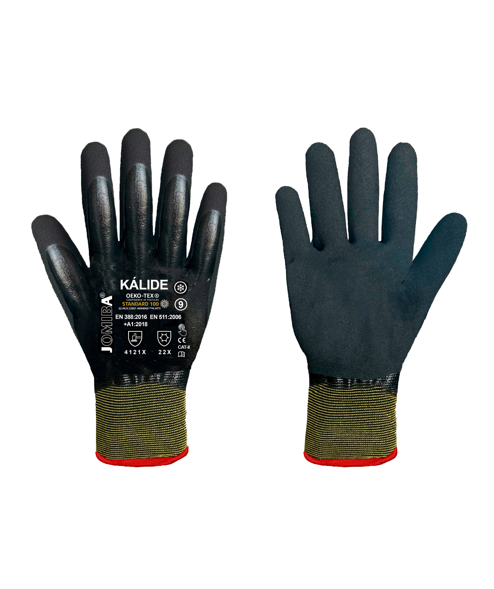El guante KÁLIDE de Jomiba es un modelo con Tecnología G-FLEX® y soporte de poliéster / acrílico. Cuenta con doble recubrimiento de nitrilo liso + arenoso. Aptos para ser utilizados a bajas temperaturas frio convectivo (aislamiento térmico / nivel 2) y frio por contacto (resistencia térmica / nivel 2).