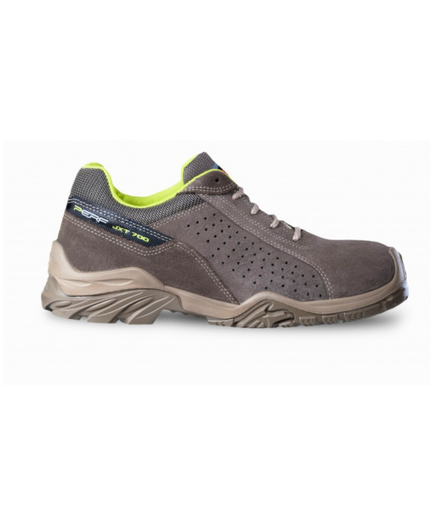 Zapatos de seguridad Force 3 PERF. Este modelo se basa en un corte de cuero ante perforado gris y cuenta con una puntera de protección composite en la parte delantera del pie. Disponible en Talla 44.